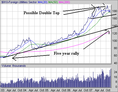 Foreign utilities look very impressive. They have been rising for five years. But they had a really big move starting in mid-2006. They have been consolidating for most of this year and may be forming a double top. If they successfully bounce off the shorter support line from this year's consolidation it will be a good sign.