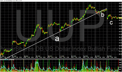 The Treasury market has broken trend (a). Also note the EMA picture is becoming more and more bearish -- the 10 and 20 day EMAs have moved through the 50 and all are moving lower.