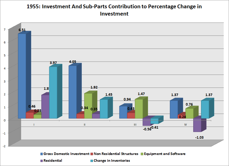 In 1955, investments occurred on a variety of fronts. The first quarter saw a huge increased in private inventories, while equipment and software contributed to the second and third quarter growth. Inventories and business investment was largely responsible for investment growth in the fourth quarter.